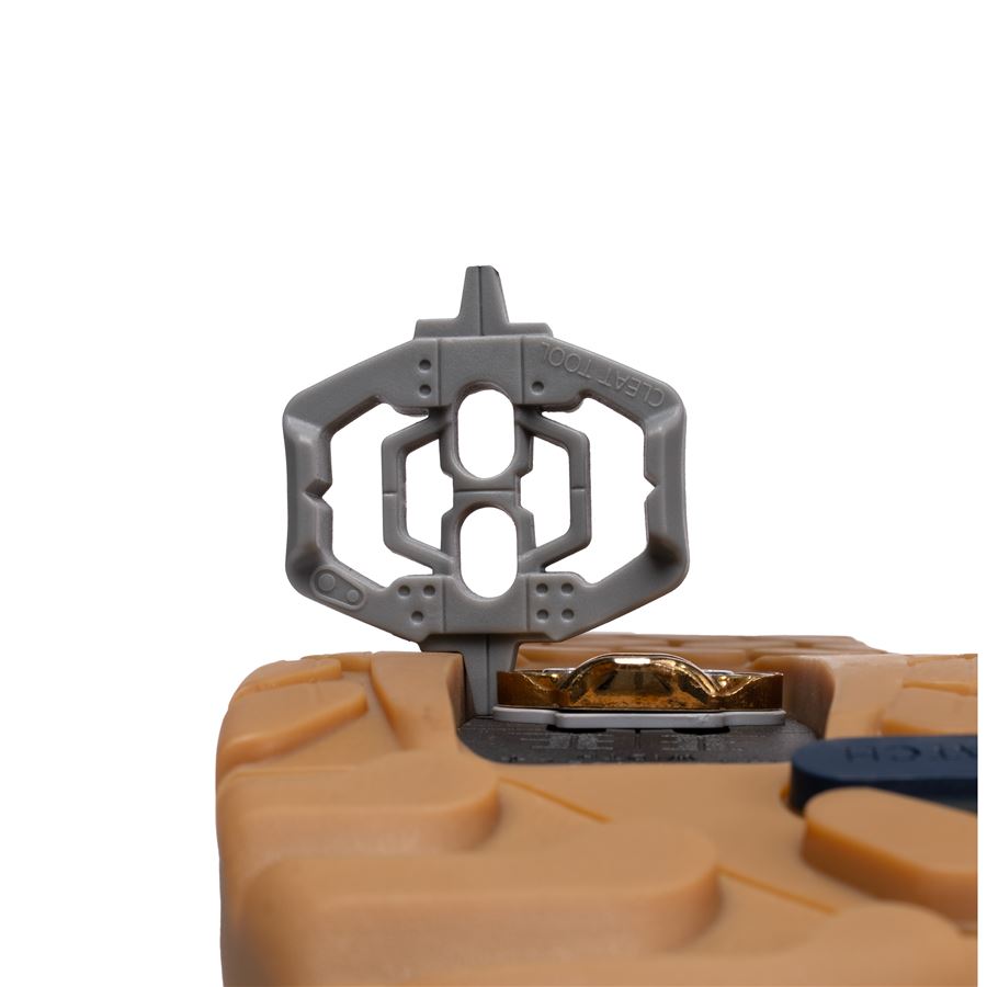Náš nový nástroj je navržen tak, aby zjednodušil proces instalace zarážek a je ideální pro nastavení polohy zarážky pro levou i pravou botu (nebo pro více párů bot). Vizuální vodítka zabudovaná do nástroje umožňují jezdci nastavit preferované boční, přední/zadní polohy a rotaci zarážek, zatímco tvar nástroje umožňuje využít větší páku, aby se zarážky během utahování nehýbaly. A pro uživatele pedálů Crankbrothers je tu vestavěný měřič hloubky dezénu, který usnadňuje nalezení správné tloušťky podložky pod zarážky pro optimální rozhraní mezi botou a pedálem.