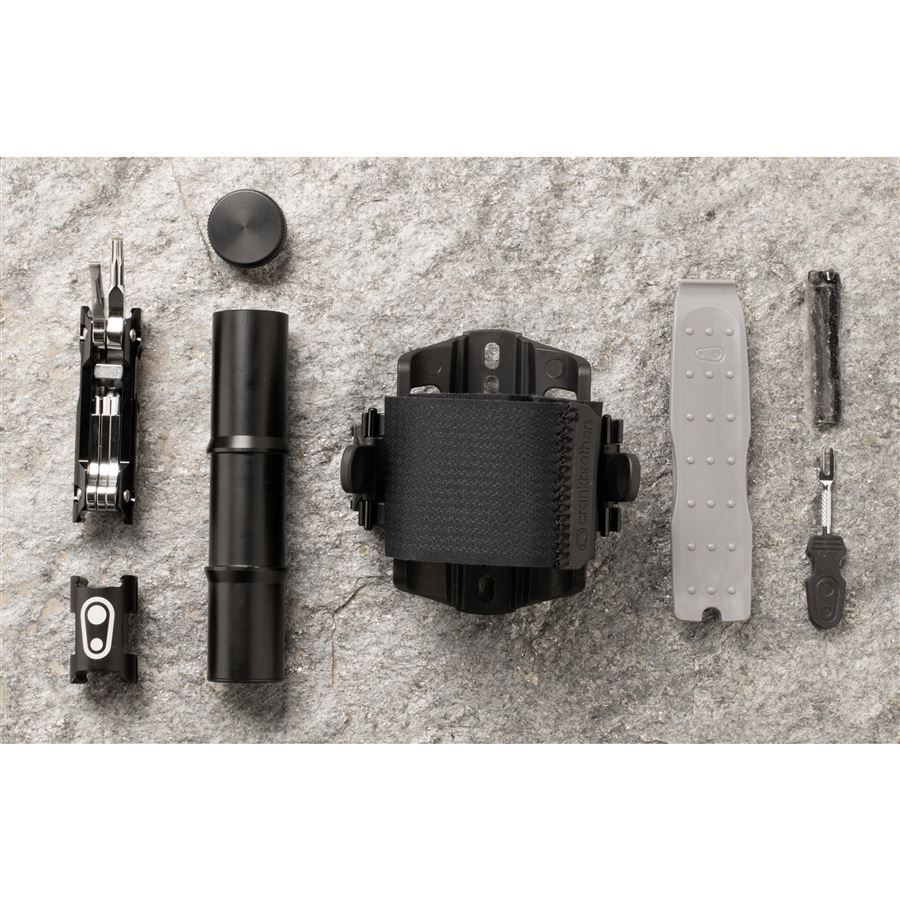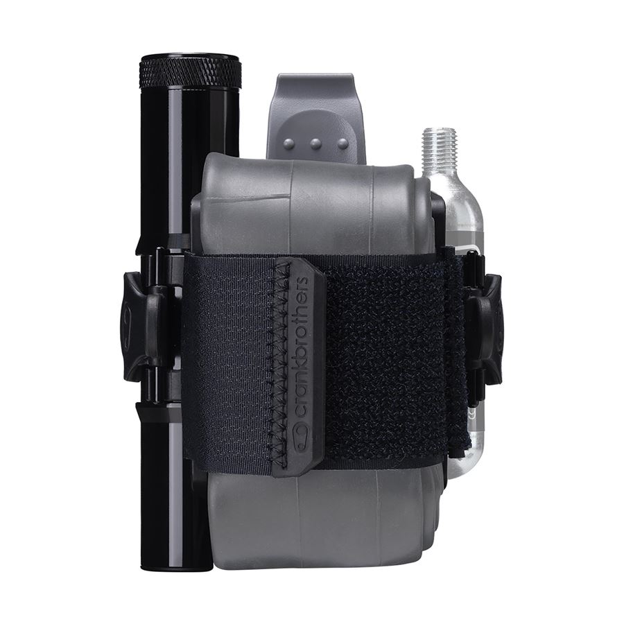 Držák náhradní duše nebo dalšího vybavení s páskem na suchý zip. Montáž místo košíku. V bočním úložném prostoru našlo místo velké multifunkční nářadí a na druhou stranu košíku je možné připnout CO2 bombičku nebo minipumpu.