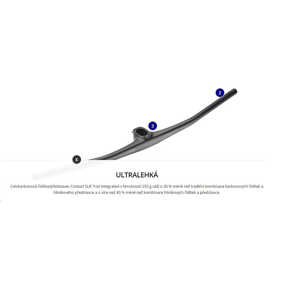 Integrovaná řídítka/představec Contact SLR Trail přinášejí nastavitelnost, poddajnost, nízkou hmotnost a čistý jednoduchý profil. Nabízejí všechny výhody jednodílného řešení řídítek a představce, ale s nastavitelností konvenčního dvoudílného řešení. Odolná patentovaná karbonová konstrukce a štíhlejší profil v blízkosti středu pomáhají absorbovat vibrace pro lepší kontrolu a pohodlí rukou v členitém terénu. Integrovaný design horní krytky usnadňuje montáž cyklopočítače, kamery GoPro nebo světla.