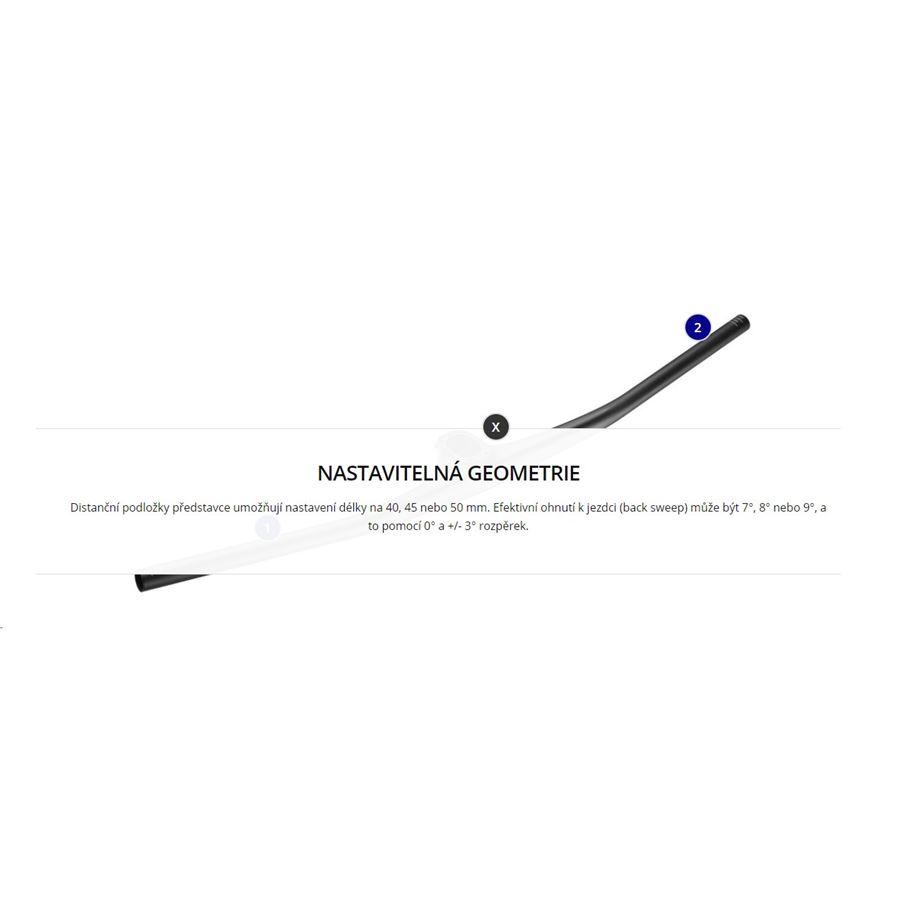 efektivní ohnutí k jezdci (back sweep): 7°, 8° nebo 9° pomocí 0° a +/- 3° rozpěrek