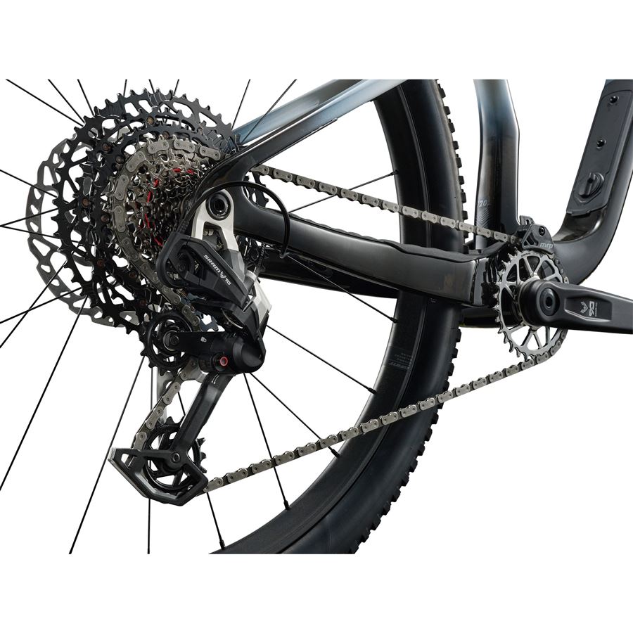 RÁM Advanced SL-grade composite front and rear triangles, 120mm FlexPoint Pro suspension, flip chip, 12x148mm thru-axle, internal storage