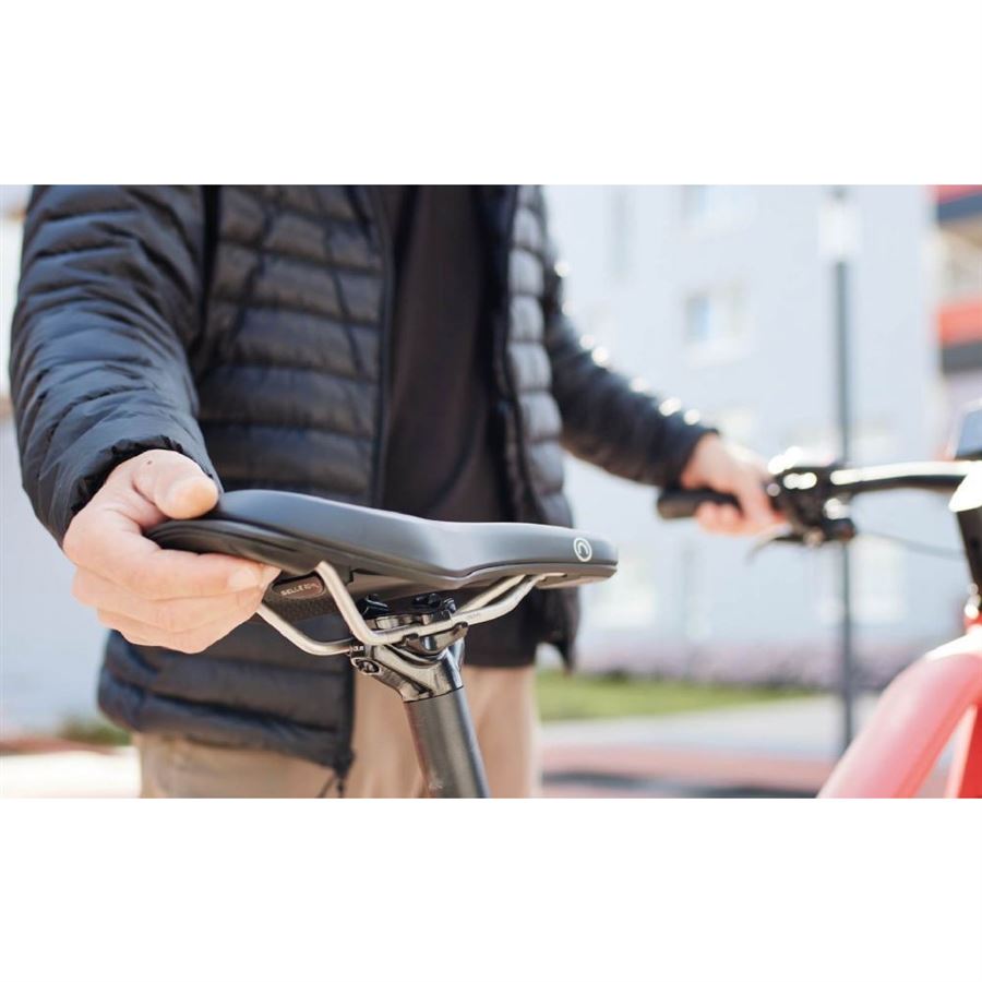 Sedlo On Open je speciálně navrženo pro elektrokola tak, aby zajistilo nejlepší možný komfort a ovladatelnost: jeho poddajné bočnice usnadňují šlapání, zatímco vyvýšená zadní část sedla vám pomůže najít okamžitě tu správnou pozici na sedle. Polstrování je vyrobeno z našeho Royalgelu, který v porovnání s klasickým polstrováním tlumí rázy o 40% lépe. Centrální výřez navíc ulevuje citlivým tkáním a zlepšuje ventilaci.