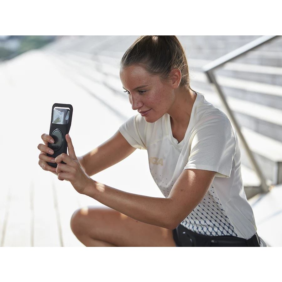 Magnetické foto pouzdro na telefon lze používat s držákem na řidítkách nebo s oběma běžeckými pásy. Díky průzoru na zadní straně pouzdra lze pořizovat fotografie z výletů, aniž byste museli telefon z pouzdra vyndávat.