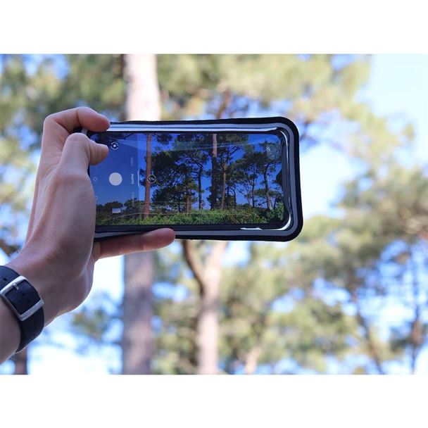 Magnetické foto pouzdro na telefon lze používat s držákem na řidítkách nebo s oběma běžeckými pásy. Díky průzoru na zadní straně pouzdra lze pořizovat fotografie z výletů, aniž byste museli telefon z pouzdra vyndávat.