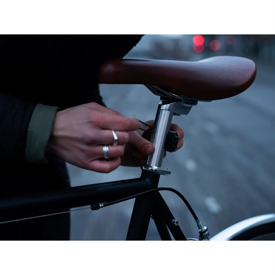 Díky pevné základně není potřeba pokaždé sundávat a vyměňovat gumičky, stačí vyjmout světelnou část. Když je vaše kolo venku, vyjměte světlo, abyste předešli riziku krádeže. Je také snadné dobít baterii světla.