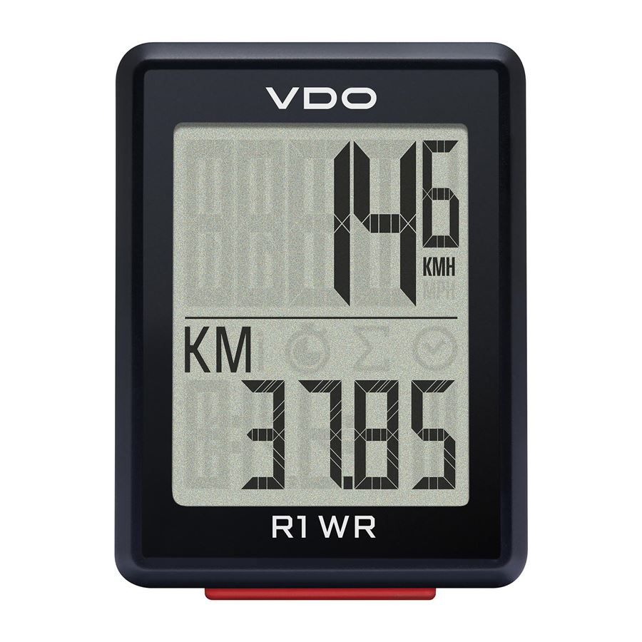Základní drátový computer VDO R1 WR je spolehlivým společníkem pro všechny, kteří chtějí mít na svých cyklo výletech přehled o pěti nejdůležitějších hodnotách – ať už při cestě do práce nebo při víkendovém výletu na kole. Velký, snadno čitelný displej computeru zobrazuje okamžitou rychlost, denní a celkovou vzdálenost, čas jízdy a hodiny. Pro větší přehlednost jsou jednotlivé funkce označeny ikonami. Nastavení a ovládání R1 WR je velmi snadné díky výraznému červenému funkčnímu tlačítku. Díky integrované tabulce plášťů je nastavení obvodu kol snadnou záležitostí. Držák na řídítka pro vodotěsný computer lze rychle namontovat na kolo pomocí přiložených stahovacích pásků. Computer lze poté snadno vyjmout a uschovat, čímž jej ochráníte před možným odcizením. Drátové propojení vysílače a compteru zajišťuje plynulé a bezproblémové měření bez nutnosti instalace baterie do vysílače. Přiložená baterie (CR2032) postačí k napájení computeru po dobu delší než dva roky.